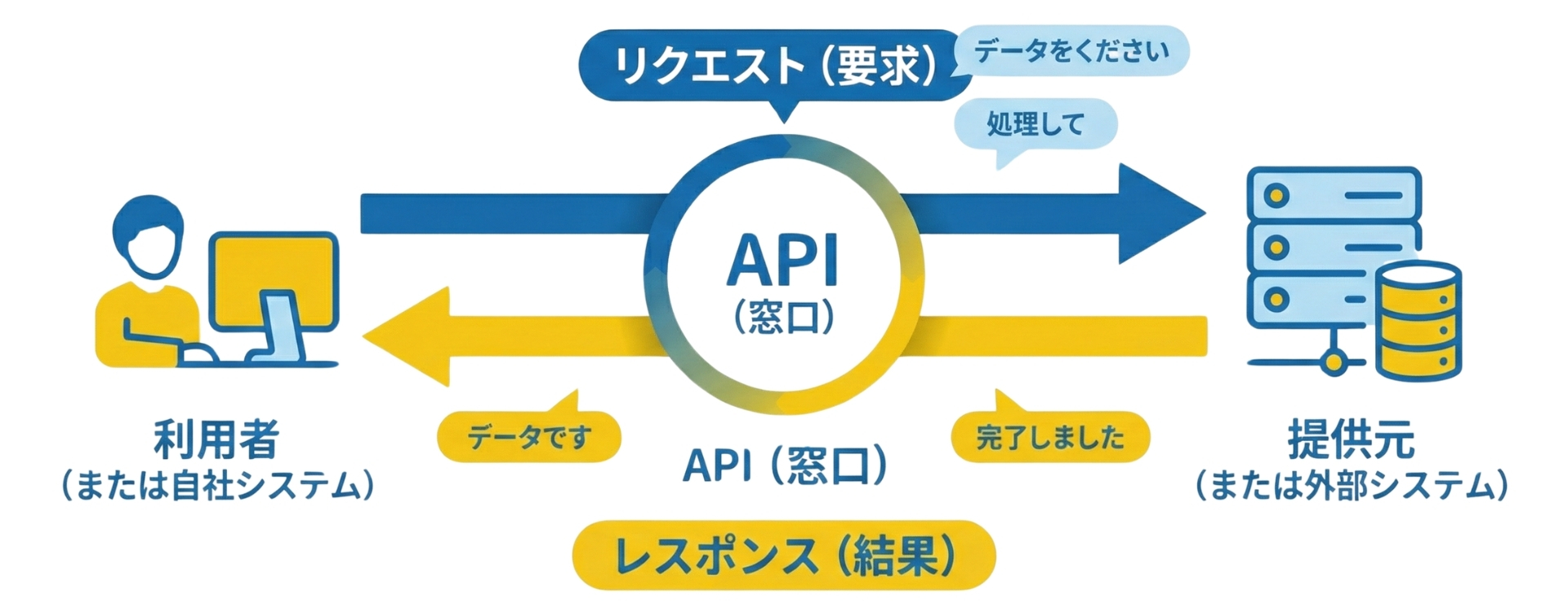 APIは、異なるアプリケーションやソフトウェアの間で必要な情報や機能を呼び出せるようにするためのインターフェースです。「Application Programming Interface」の略で、利用側がAPIにリクエストを送ると、提供元のシステムがそれを処理し、結果をレスポンスとして返します。