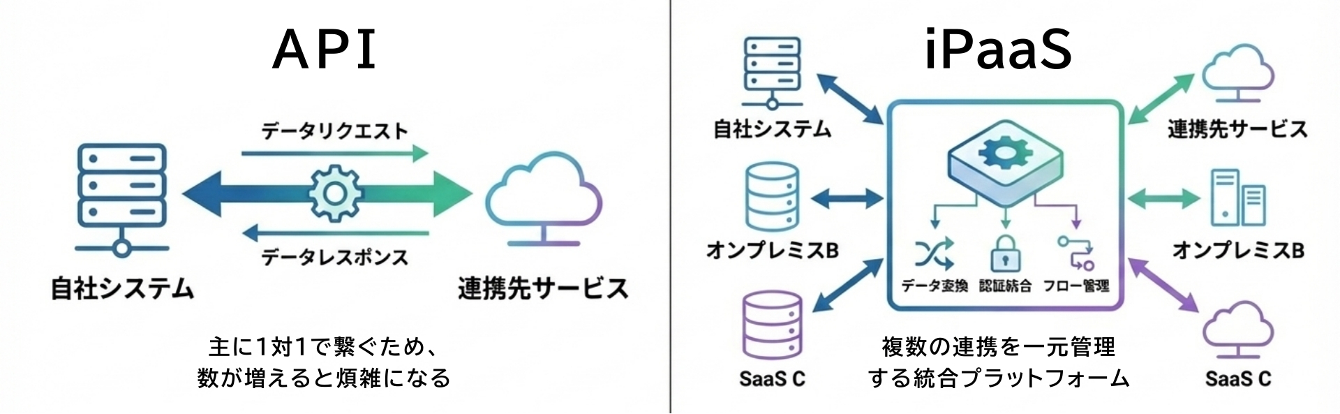 APIを使った連携自体は有効ですが、対象システムが増えるほど管理の負担が大きくなるため、複数のサービスを継続的に連携させたい場合にはiPaaSのような統合基盤の導入が有効な選択肢となります。