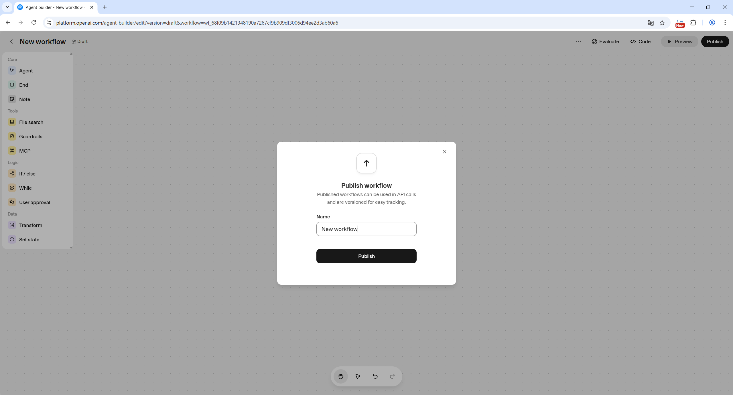 - ワークフロー名を入力して Publish ボタンをクリック