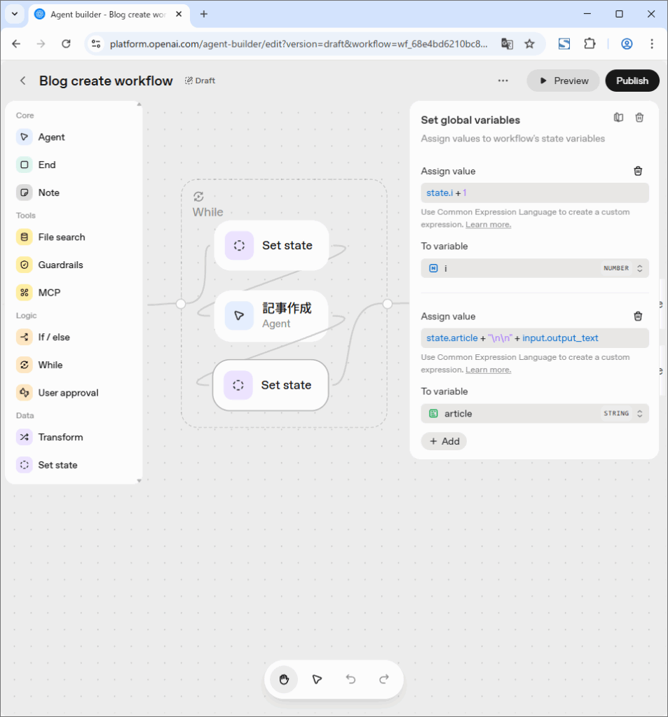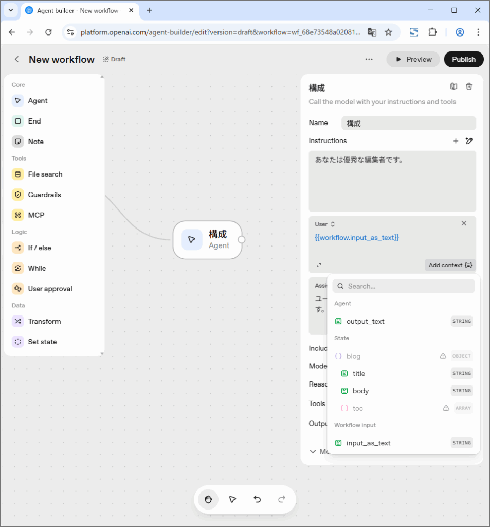 に格納されておりワークフローのどこからも参照できます。それ以外の変数は各ノードの直後のみ参照可能でノードの処理結果を確認できます。