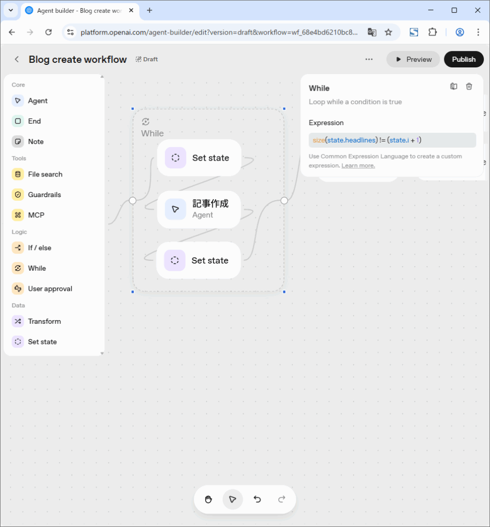 ループする条件をCELで指定します。条件を満たしている間Whileノード内の処理を繰り返します。ノードをドラッグアンドドロップでWhileノードの中に移動できます。
